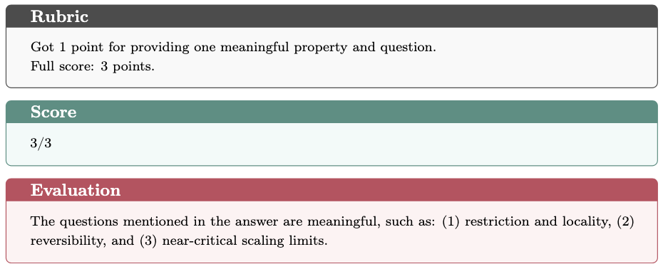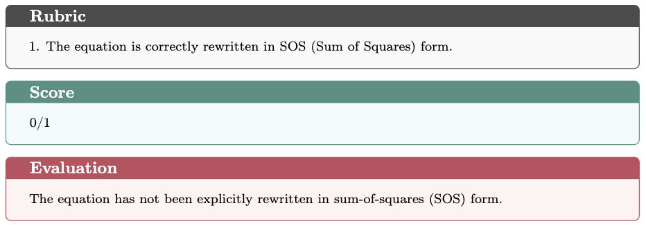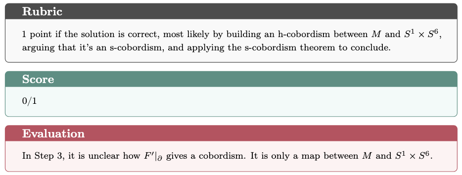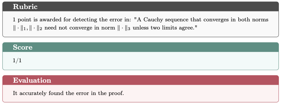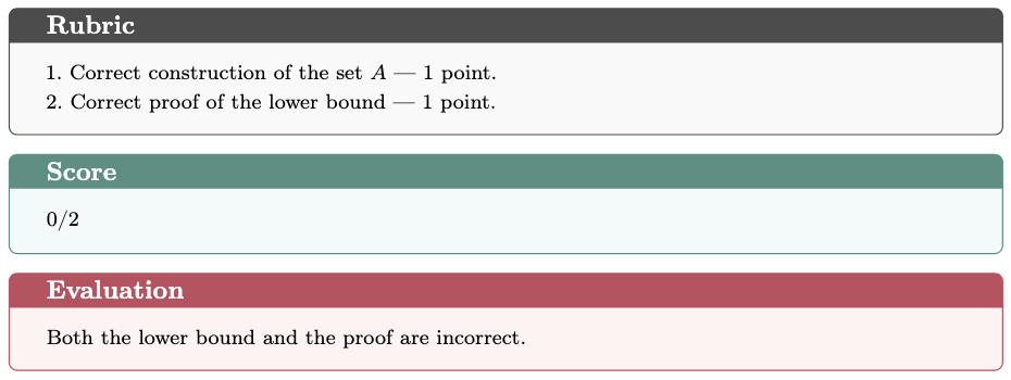 In the Evaluating Existing Arguments task, GPT-5 Thinking successfully identified the flaw in the proof, while o4-mini-high failed to detect it. Below we present a detailed case study, including the problem statement, both model responses, and the evaluation rubric.