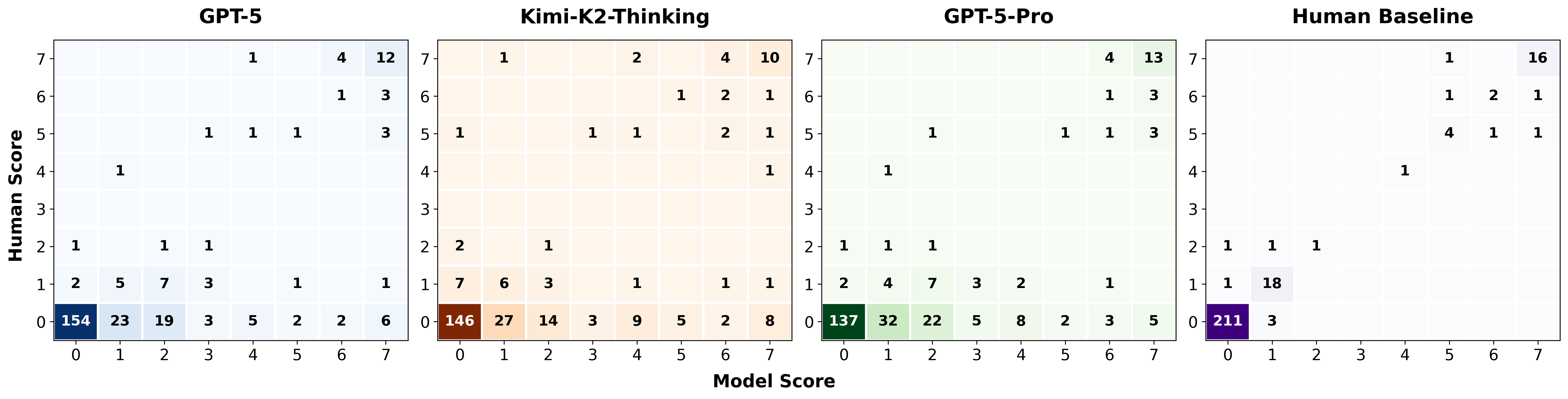 - The Good: Globally, GPT-5 aligns well with human judgment (Pearson correlation of 0.746). For coarse-grained evaluation, it is highly effective, with 91.7% of its predictions falling within points of the human score.