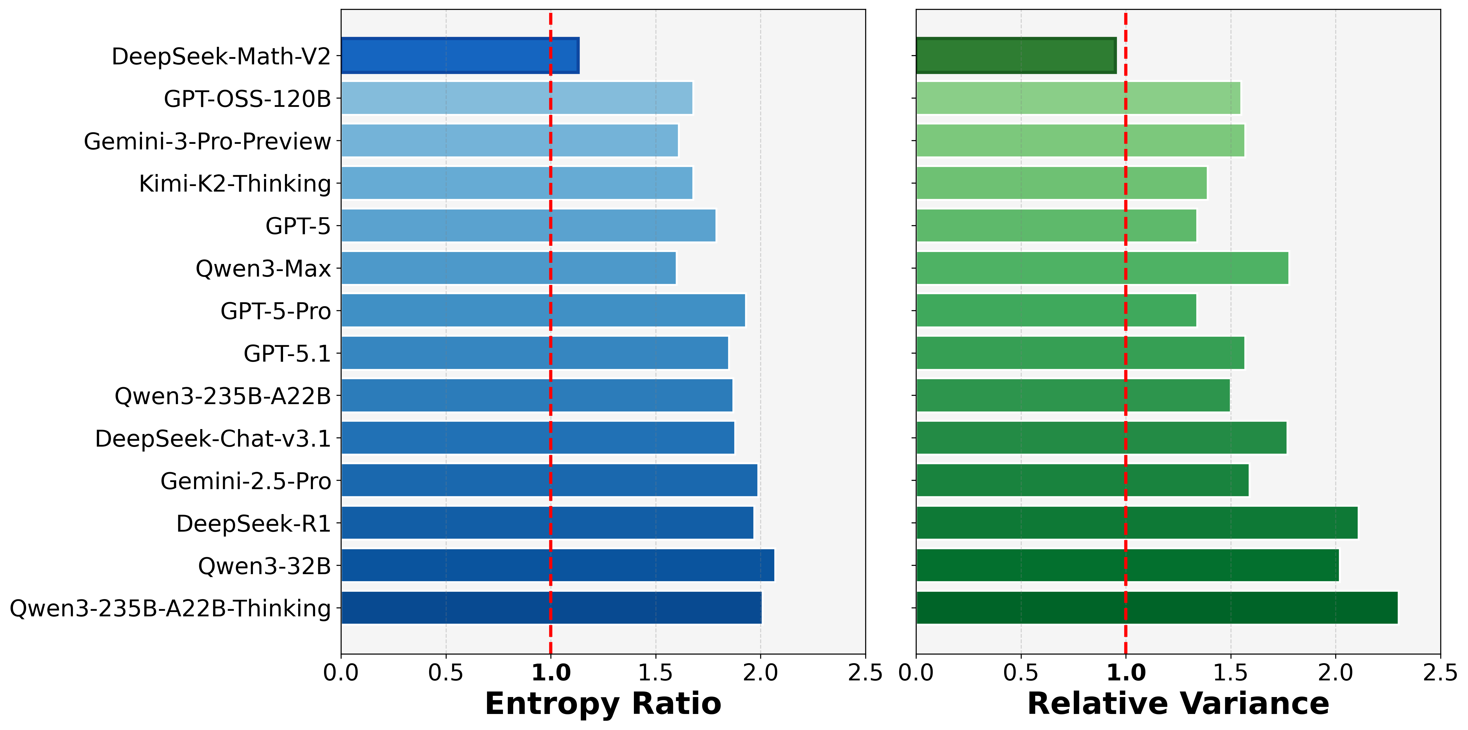 DeepSeek-Math-V2 behaves exceptionally good in these two metrics with closer to 1 value on ER (entropy ratio) and RV (relative variance).
