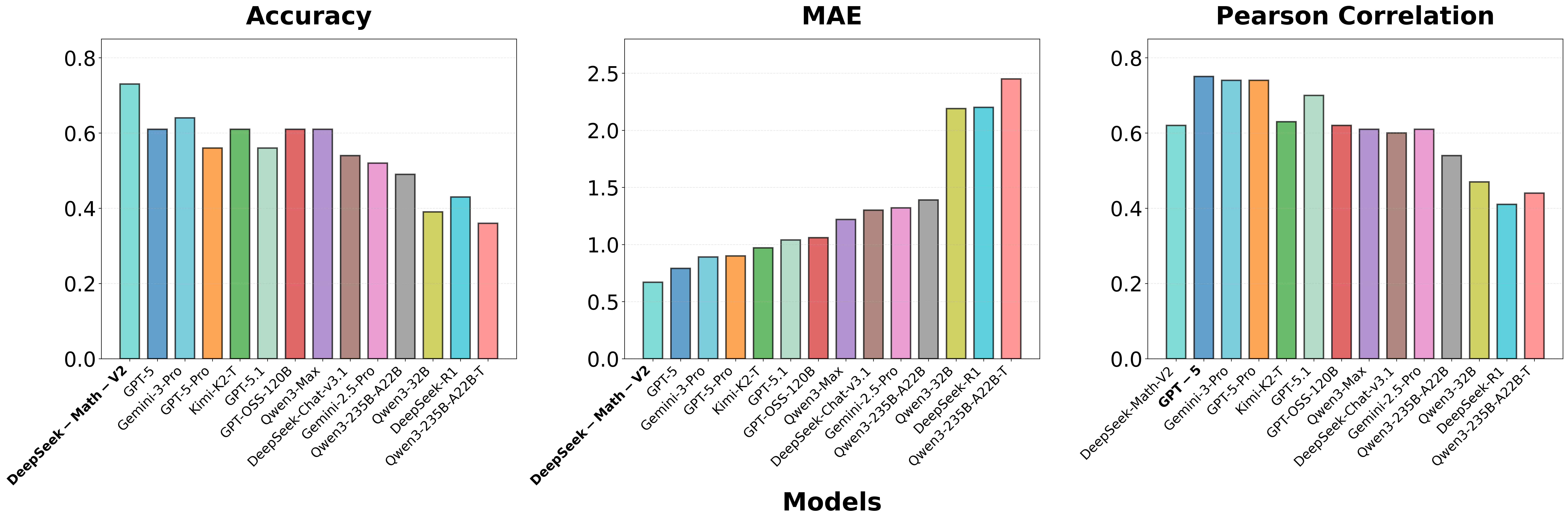 DeepSeek-Math-V2 emerges as the best overall model, achieving the lowest MAE (0.67), highest accuracy (0.73), and competitive Pearson correlation (0.62). This suggests it excels at precise numerical predictions. GPT-5, GPT-5-Pro, and Gemini-3-Pro form a cluster of high-performing models with MAE values below 1.0, accuracy around 0.56–0.64, and Pearson correlations of 0.74–0.75. These models balance well across all metrics.